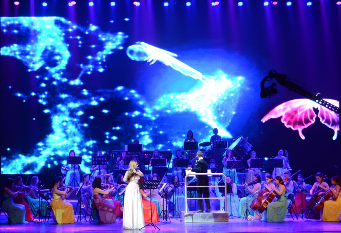 這場(chǎng)交響音樂會(huì)帶給現(xiàn)場(chǎng)觀眾的是觸及心靈的體驗(yàn),既有大家熟悉的貝多芬、肖邦、莫扎特、小約翰•斯特勞斯的名曲,如《藍(lán)色多瑙河圓舞曲》、《匈牙利舞曲》等耳熟能詳?shù)墓诺浣豁憳访灿行轮袊?guó)成立后的紅歌經(jīng)典,如《北京喜訊傳邊寨》等。據(jù)相關(guān)負(fù)責(zé)人介紹,“維納斯女神”愛樂樂團(tuán)于2003年在德國(guó)柏林成立,是整個(gè)歐洲乃至全球唯一一個(gè)全部由女子組成的古典交響樂團(tuán),其成員在全球范圍內(nèi)進(jìn)行招募,入選條件十分“苛刻”,可謂“魔鬼”式的篩選,是世界音樂界的“選美大賽”。她們帶給觀眾的不僅是國(guó)際范兒的窈窕淑女、華美絕倫的服飾、高雅的舞美設(shè)計(jì)、構(gòu)思獨(dú)特的編排、優(yōu)雅動(dòng)聽的音樂,還有對(duì)高雅文化生活的享受和美好生活的向往。